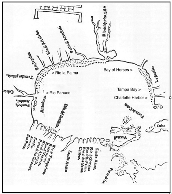 ”The destination of Narváez, on leaving Cuba with his settlement expedition, had been the Río de las Palmas, north of Pánuco, present-day Tampico, Mexico. His fleet ran aground near the western edge of Cuba, and after 15 days aground he repaired his ships, then set sail again, this time bound for Havana to resupply. Storms and prevailing winds prevented him from reaching Havana, forcing him to go north, and he eventually spotted Florida. During the nearly two-month ordeal since leaving Cuba, thirty-eight of his horses had died.”