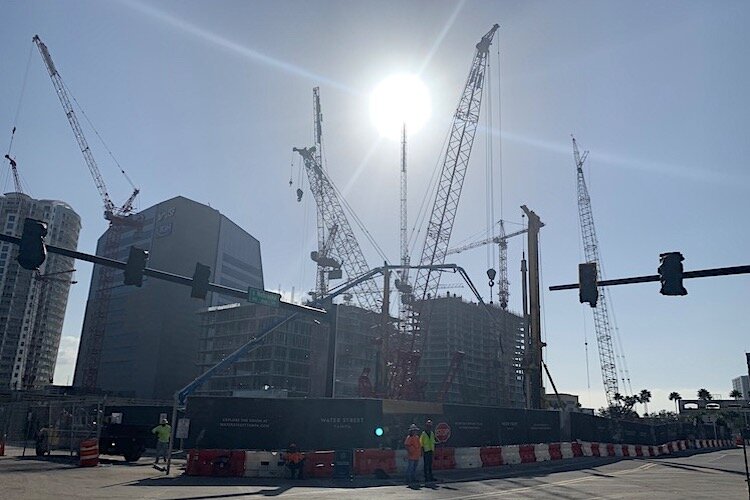 Among the innovations offered by the new District Cooling chiller is its connection to a network of buildings in Water Street Tampa. The large central chiller will efficiently distribute chilled water to the majority of the buildings under construction or planned. This cooled water flows through heat exchangers that absorb heat from buildings before it recirculates to the central plant in the enormous closed-loop system.
