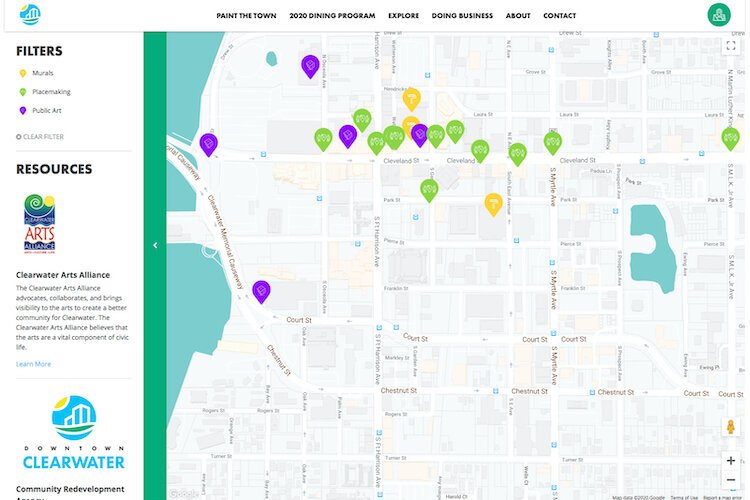 Clearwater’s virtual map concept evolved from the Arts Alliance’s printed guide to aid volunteer docents and self-guided tours. The project culminated earlier this year when they led their first walking tour, but COVID-19 hit and stalled plans of further putting the printed version to use.