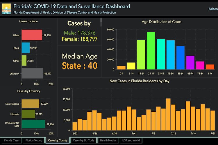 Florida Department of Health – Demographics of Florida COVID-19 cases as of July 21, 2020.