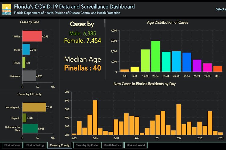 Florida Department of Health – COVID-19 cases in Pinellas (Clearwater-St. Pete) as of July 21, 2020.