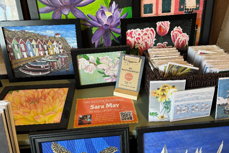 There are paintings and postcards by Sara May, a Tampa artist who paints with the brush in her mouth after being disabled by Multiple Sclerosis.