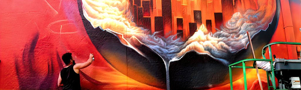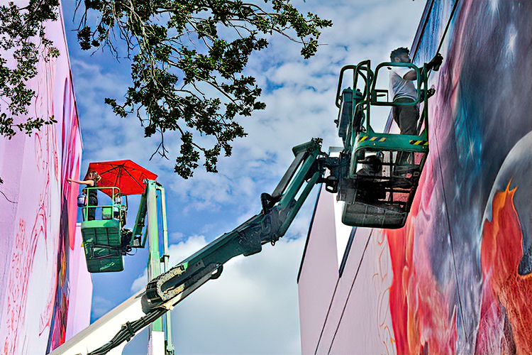 Elevated by a boom lift, Isac Gres adds touches to his mural “The Taste of Creation” while Taylor Smith, aka Dreamweaver, is on another lift busy creating her own giant masterpiece on the 600 block of Central Avenue.