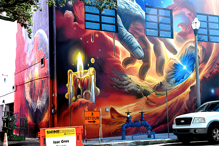 Covering two building walls on the 600 block of Central Avenue, surrealist artist Isac Gres’s “The Taste of Creation” is an impressive large-scale mural filled with symbols dear to Gres.
