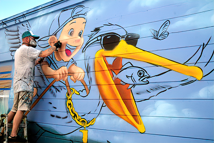 Derek Donnelly’s contributions to this year’s SHINE are this painting of his son riding a pelican that’s gobbling a fish and a mural at the Hollander Hotel.