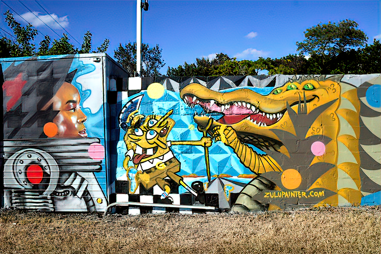 A prolific muralist whose work can be seen throughout St Pete and across the country, multi-media artist Carlos Culbertson, aka Zulu Painter, worked on two types of canvas to create his artwork of a Florida alligator for SHINE 2025.