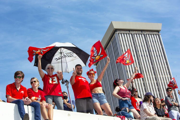 Downtown Tampa turned into a sea of red and pewter Wednesday afternoon as thousands of football fans sporting the Tampa Bay Buccaneers team colors flocked to the waterfront to enjoy a boat parade celebrating their win in Super Bowl LV.