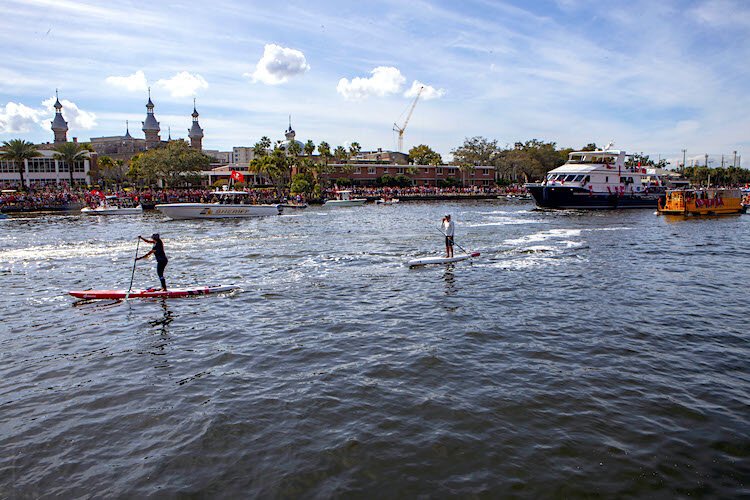Photos by Kimberly DeFalco – Masked skate boarders buzz among thousands of Tampa Bay Bucs fans on The Tampa Riverwalk.