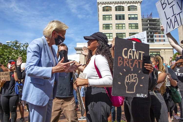 Photo by Kimberly DeFalco – Tampa Mayor Jane Castor leans in to listen to a protestor.