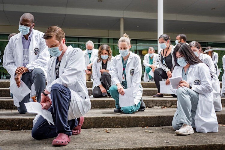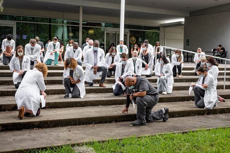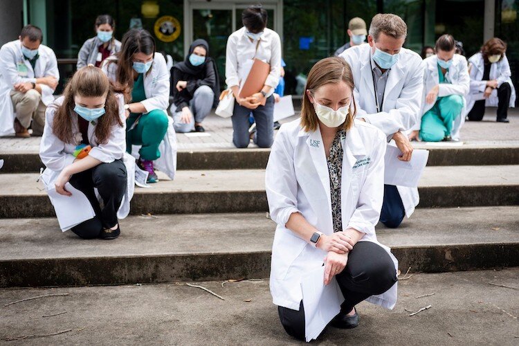 Courtesy of USF Health – Healthcare workers kneel in honor of #whitecoatsforblacklives.