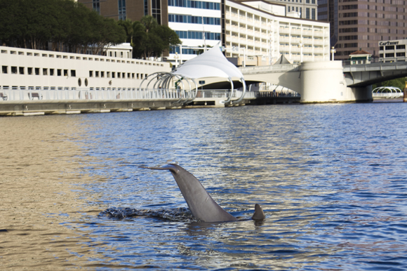 Photo by Julie Branaman – A dolphin is seen slapping its tail from the boat near Curtis Hixon Park.