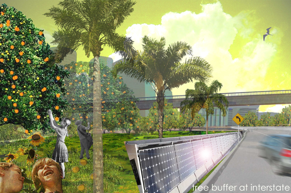 The graduate students’ design transforms the space with a 12-acre terrace garden, running along the edge of the Interstate. The plan calls for palm and citrus trees close to the highway, to mitigate noise and pollution.