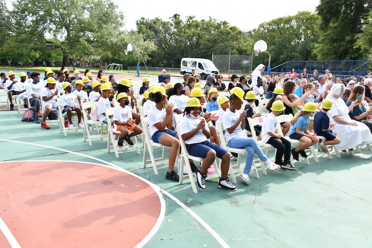 Children wearing construction hard hats mingled with community supporters and alumni during the June 17 groundbreaking ceremony for the Villa Madonna School Pavilion and Campus Renovation Project in Tampa Heights.