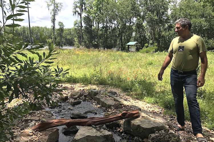 While we could have toured the property on solar-powered, student-built golf carts, it feels right to connect with the Bishops’ land on foot. At the outer edge of Rosebud Continuum, several acres have undergone a labor-intensive “rewilding” to restore the natural wetland environment with native Florida flora. The wildflowers are returning, and with them, species of wildlife that inhabited the land before us — as it should be, the Bishops say.