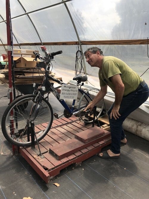 On the way from the food forest to the fab lab, we pass by a solar-powered greenhouse where edible plants thrive in aqua and hydroponics systems fine-tuned by Global Sustainability M.A. students. And a bicycle-powered generator powers the lights, waterless toilet facilities recycle waste into nutrient-rich soil, a biodigester “dragon” gobbles food scraps to produce methane biofuel for cooking and organic liquid fertilizer, and anaerobic digestion takes place in a “stomach” made from a queen-size air mattress.