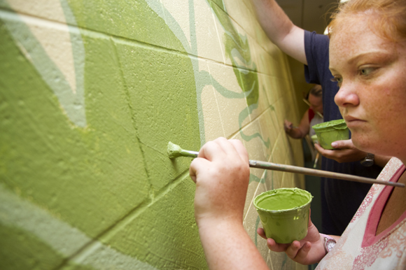 A petite, 19-year-old redhead, Chrissy Pettineo, focuses intently on the enormous split-leaf philodendron leaf she is painting on the wall in front of her. A good five-feet long, the dark green leaf crawls jungle-like across the wall, which also sports a brand new coat of soft yellow paint.