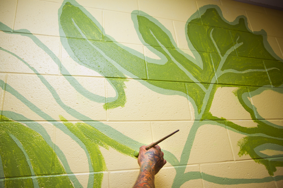Now the philodendron leaves that Pettineo is helping paint are just the start. Sea grapes, elephant ears and macho ferns — all Florida native plants, will soon be added to the walls. Florida flowers in shades of pink will decorate the women’s pod.
