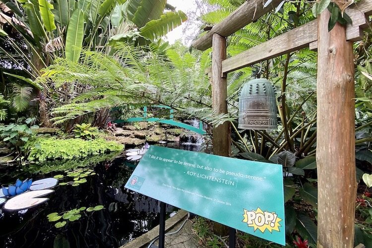 The current exhibit showcases the pop art culture of Lichtenstein’s work (think Ben-Day dots) in the midst of lush gardens populated by air plants, orchids, water lilies, daisies, native palms, vines, and other greenery reminiscent of Impressionist Artist Claude Monet’s garden in Giverny, France.