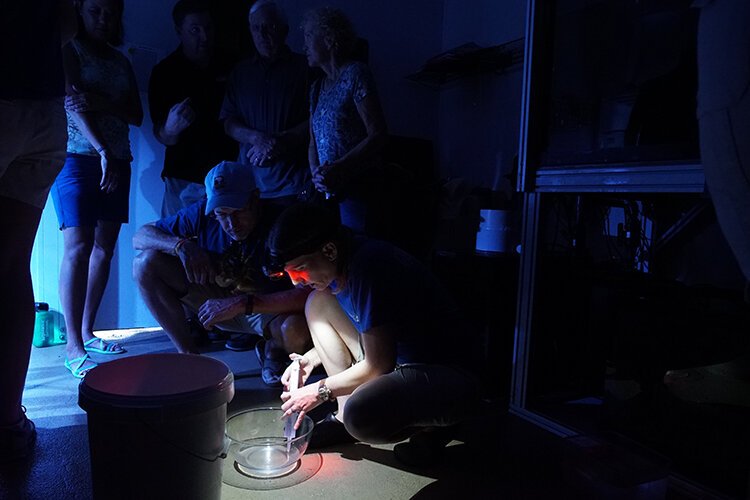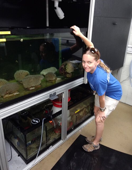 William March – Keri O’Neil looks into a tank where artificial lights used to induce coral to spawn.