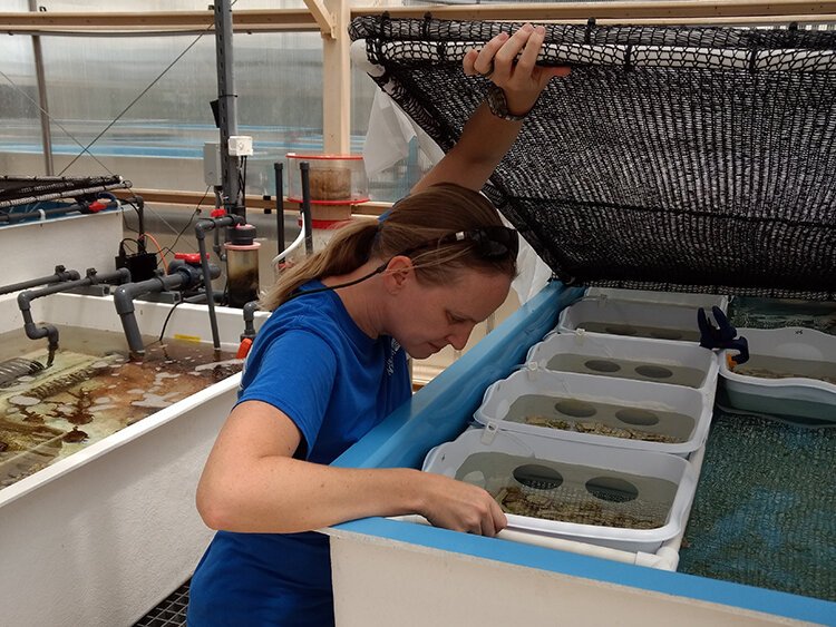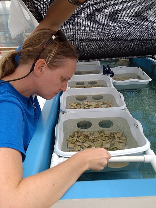 Keri O’Neil examines the tiny, barely visible, newly-spawned coral polyps.