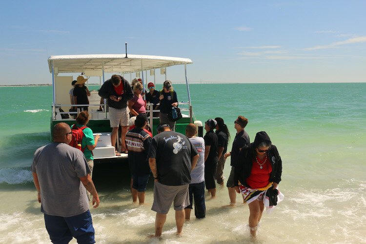 Courtesy of Dave Scheidecker – Seminole Tribe members disembark at Egmont Key. The Skyway Bridge is visible in the background.
