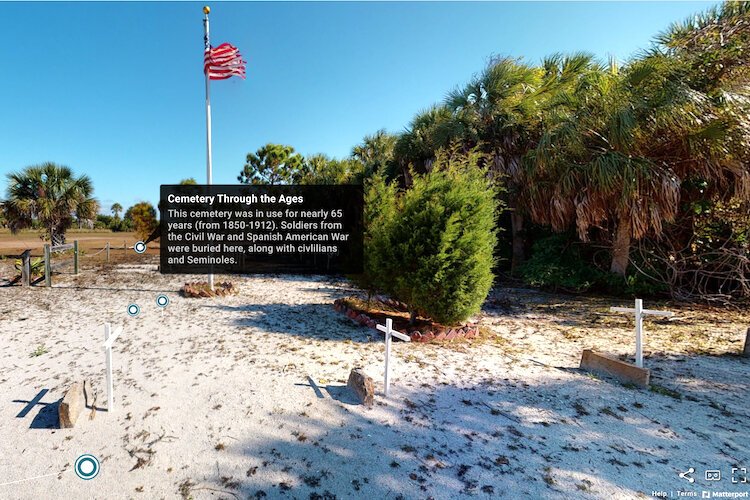Photo courtesy of USF 3D Lab – USF Access 3D Lab uses a Matterport 3D camera to scan sites on Egmont Key. Each white dot in this screenshot represents a “Matterport tag” on which virtual visitors can click to learn more when they visit a Matterport gallery.