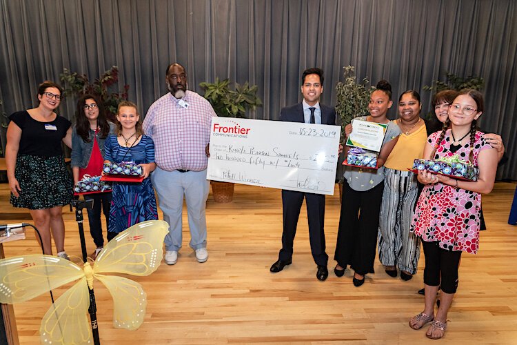 Courtesy of Tony Selvaggio – Tony Selvaggio holds the check from Frontier Communications for the Dowdell Middle School student who won the business pitch competition.