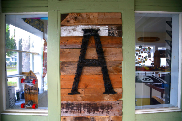 Well-tended plants and palm trees surrounded by a small sandy “beach” indicate new life at the corner of Platt Street and Melville Avenue, where wheels decorate the windows and brightly painted boards hang in a refurbished 1926 bungalow.