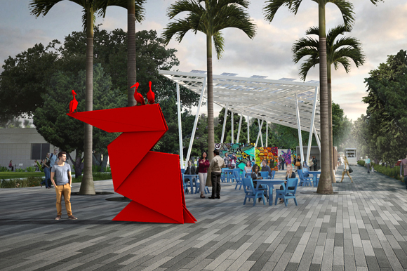 “The origami was an interesting approach, with a little nod to our sister city over in Japan,” Atherholt says, in reference to Takamatsu, Japan. “The pelican is obviously a symbol of the city and has interactivity in it. There’s a chance to add additional pelicans to the proposal. One person has bought [the addition of] a pelican already.”
