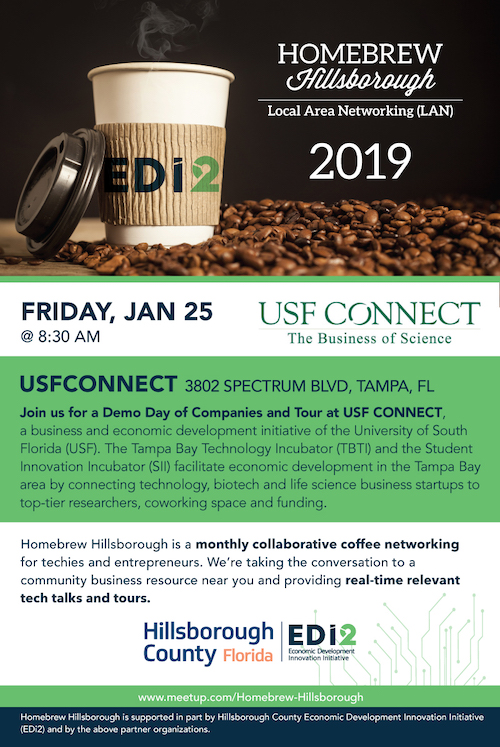 - Homebrew Hillsborough, a local networking group for entrepreneurs and techies, meets Friday, Jan. 25, at 8:30 a.m., at USF Connect, 3802 Spectrum Blvd, Tampa, where they will see a demonstration of local startup companies and take a tour of the facility.
