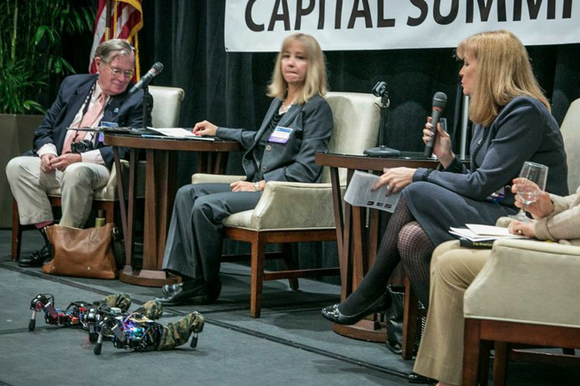 Luther Palmer of LuBotics LCC presented an engaging and advanced many-legged robot, which flashed small bright lights as it scuttled across stage. The robot could be used to climb into small, dangerous places where it is too dangerous to send humans.