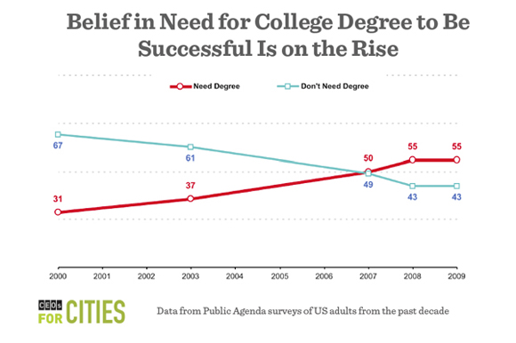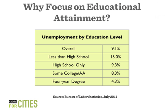 In the end, “education gains are a product of shift in entire skill distribution — not just moving a certain number of people from no degree to college graduation,” says Cortright. Any gain is good and while three years is a short time, it’s a good start.