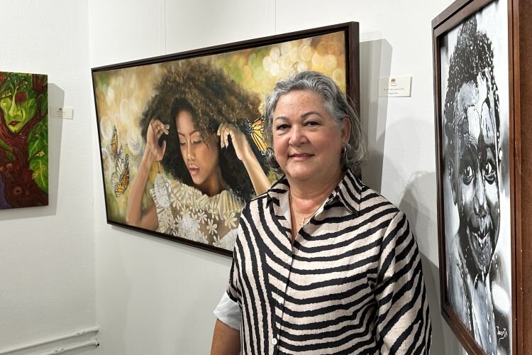 Colombian painter Raquel Núñez, a longtime member of the Coalition of Hispanic Artists, with some of her artwork in the gallery at Kress Contemporary.