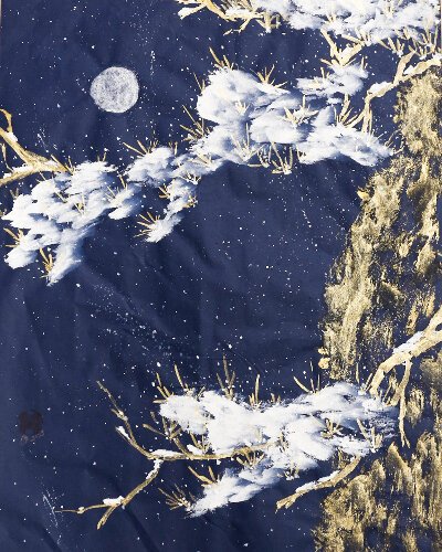 During a dynamic career, Slaymaker’s work goes through several stylistic changes. Her landscape paintings“from the early 1990s “explore the relationship between nature and modern man, with symbols from science and technology layered over serene landscapes and skies,” an exhibit description says. Art historian Robert Rosenblum described Slaymaker’s work from that timeframe as part of the Neo-Sublime and Neo-Romantic landscape movements.