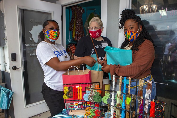 Photos by Kimberly DeFalco – Anji Degante, right, proprietor of “Accent Styles Boutique” and part of the Black Business Bus Tour, assists shoppers on Saturday’s stop.