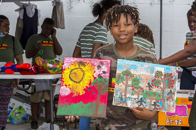 Photos by Kimberly DeFalco – Marlyn Lynn, 10, a student at LinaBean Academy, sells his artwork at the Black Business Bus Tour community celebration at Big Al’s Finger Licking Good Soul Food.