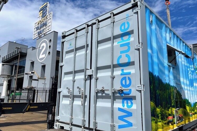 Approximately the size of a shipping container, WaterCubeTM is portable and can provide up to 10 million gallons of water daily without access to any water supply.