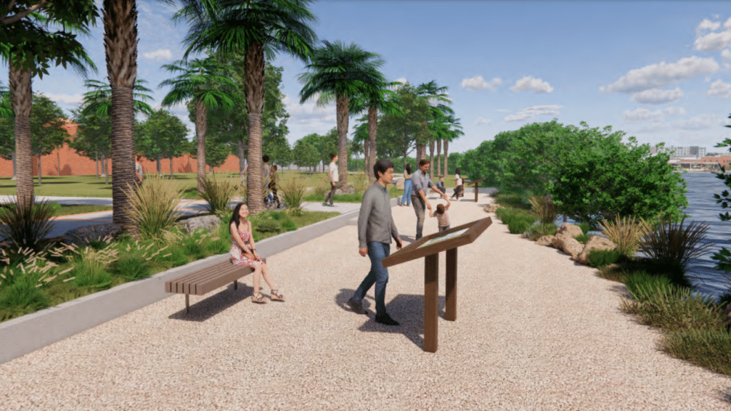 The longest single stretch of the West Riverfront expansion will be a 1.5-mile multi-use trail along the seawall from Plant Park’s brick plaza to the Martin Luther King Jr. Recreation Complex at Rome Avenue. That section will connect Plant Park, the University of Tampa, Julian B. Lane Riverfront Park, Tampa Preparatory School, Tampa River Center, Blake High, Stewart Middle Magnet School, and the Rome Yard development.