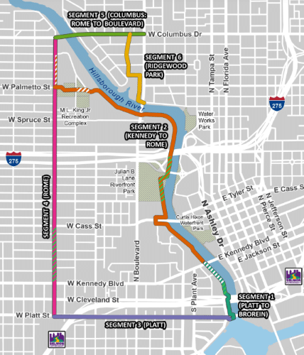 The approximately $57 million project will build out the downtown waterfront promenade, adding about two miles of trail along the west bank of the Hillsborough River and filling gaps to create a 12.2-mile continuous multi-use path running along both sides of the river down to Ballast Point Park. The project also reaches neighborhoods and streets near the Riverwalk. “Complete street” improvements on Rome Avenue and Platt Street include fresh pavement and new sidewalks, crosswalks, curb extensions, beacons, and on-street parallel parking. Platt gets a one-way eastbound separated cycle track along the south side of the road. Rome will become a north-south bike route connecting with the east-west Green Spine bicycle track at Cass Street, with improvements that include new bike lanes, sections of protected two-way cycle tracks, and newly-planted trees. On the east side of the river, West Columbus Drive and the Ridgewood Park neighborhood will also get complete street improvements.