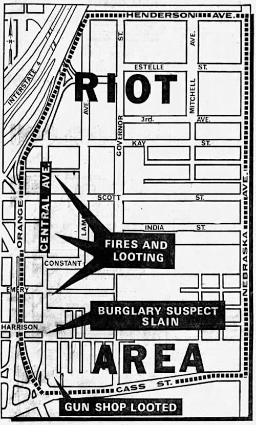Courtesy of the Tampa Bay History Center – A map showing the area of Tampa where riots occurred in June 1967.