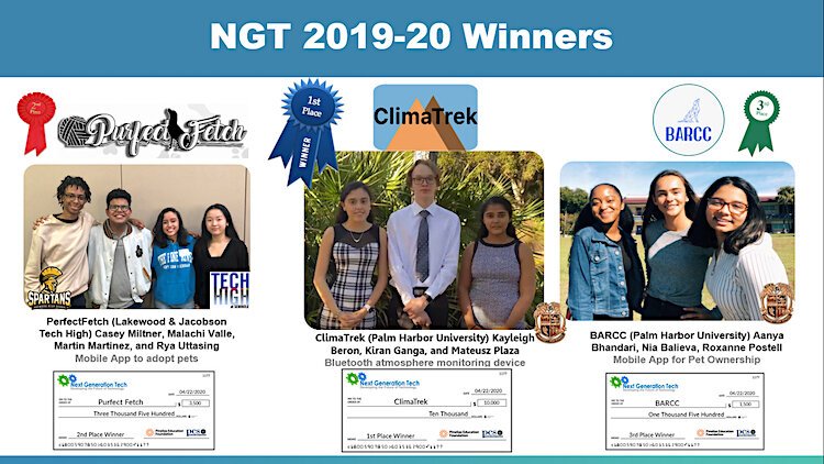 • 2nd place for PerfectFetch, a mobile app for pet adoption developed by students  Casey Miltner, Malachi Valle, Martin Martinez, and Rya Uttasing  from Lakewood High School in St. Petersburg and Jacobson Technical High School in Seminole;