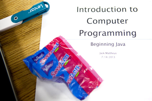 Things get quiet as Javascript appears on the projector. Some work quietly in groups of two and three while others go it alone. A few students leave their desks to help a struggling friend.