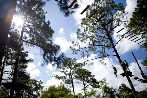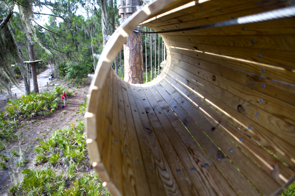 Careful consideration was taken to ensure eco-conservation in the construction of the 14-acre course, which is erected among the loblolly pines and live oak trees that grow naturally in Florida’s wetlands. TreeUmph courses were designed to minimize root damage and an innovative compression system was employed in course construction to safely secure platforms to the trees without damaging them.