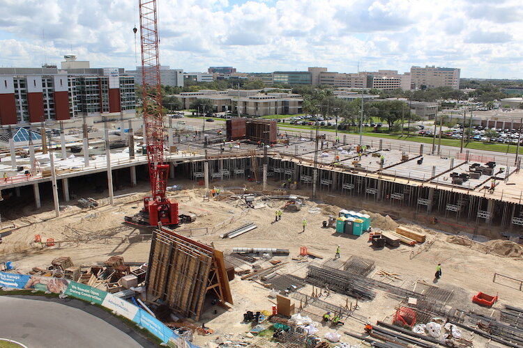 At the northeast corner of Fletcher Avenue and Bruce D. Downs Boulevard grows the $256 million AdventHealth patient and surgical tower. When AdventHealth, formerly known as Florida Hospital, opens its six-floor, 300,000-square-foot tower in summer 2021, it will include 24 operating rooms, more than 100 private patient rooms, and a 132-bed capacity with room for future expansion on the sixth floor.