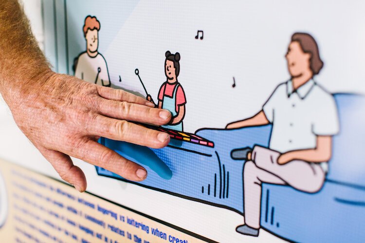 In the meantime, the Clearwater exhibit greets visitors with a colorful wall-sized, city-scape platform. Visitors can touch and engage with elements of the colorful illustration. They demonstrate how activations could exist within the city and reveal information in whimsical, unexpected ways.