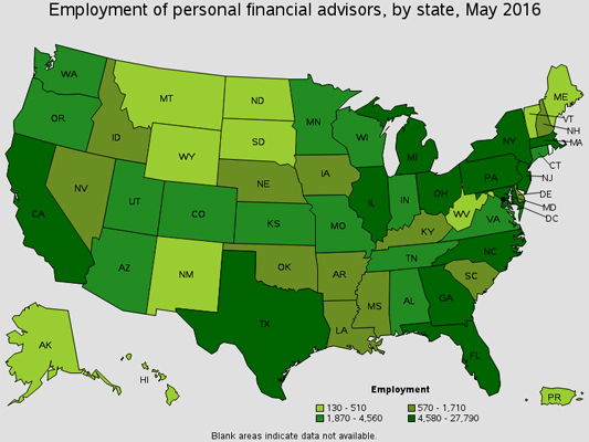The U.S. Department of Labor’s Occupational Outlook Handbook shows there is “much faster than average” growth expected in the personal financial advisors’ field, with jobs projected to increase 30 percent between 2014 and 2024.