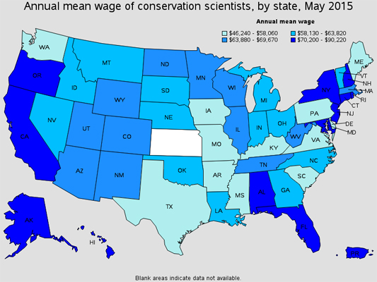 The average mean wage in 2015 for conservation scientists in Florida was $70,000-$90,220, among the highest in the nation, according to the U.S. Department of Labor’s Bureau of Labor Statistics.