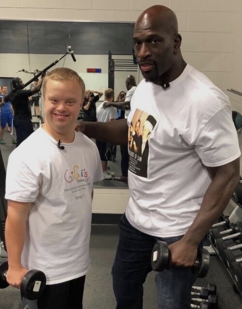 Courtesy of Renee Warmack Productions – Sam Piazza meeting his hero WWE Superstar Titus O’Neil at the local YMCA.