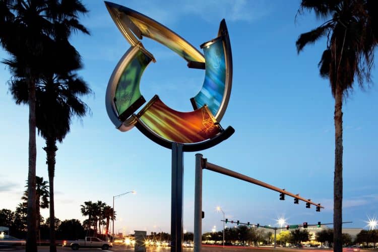 About 15 years ago, the City of Tampa and the Alliance commissioned St. Petersburg-based artist Catherine Woods to create a piece of public art to stand at the gateway to the Westshore District. Woods’ creation, “Kinetic Ring,” is a 24-foot-tall sculpture with four brightly colored, C- shaped glass panels mounted on a steel frame. Completed in 2012, it originally stood at the intersection of Kennedy Boulevard and Memorial Highway but was removed to make way for road construction. Since then, it’s sat in storage.