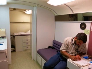 Con un solo consultorio o cuarto para exámenes médicos, el autobús de La Esperanza solo tiene capacidad para atender de entre 10 a 15 pacientes durante el horario de 5 a 7 de la tarde que con frecuencia se extiende hasta las 9 de la noche para responder a la demanda de pacientes.
